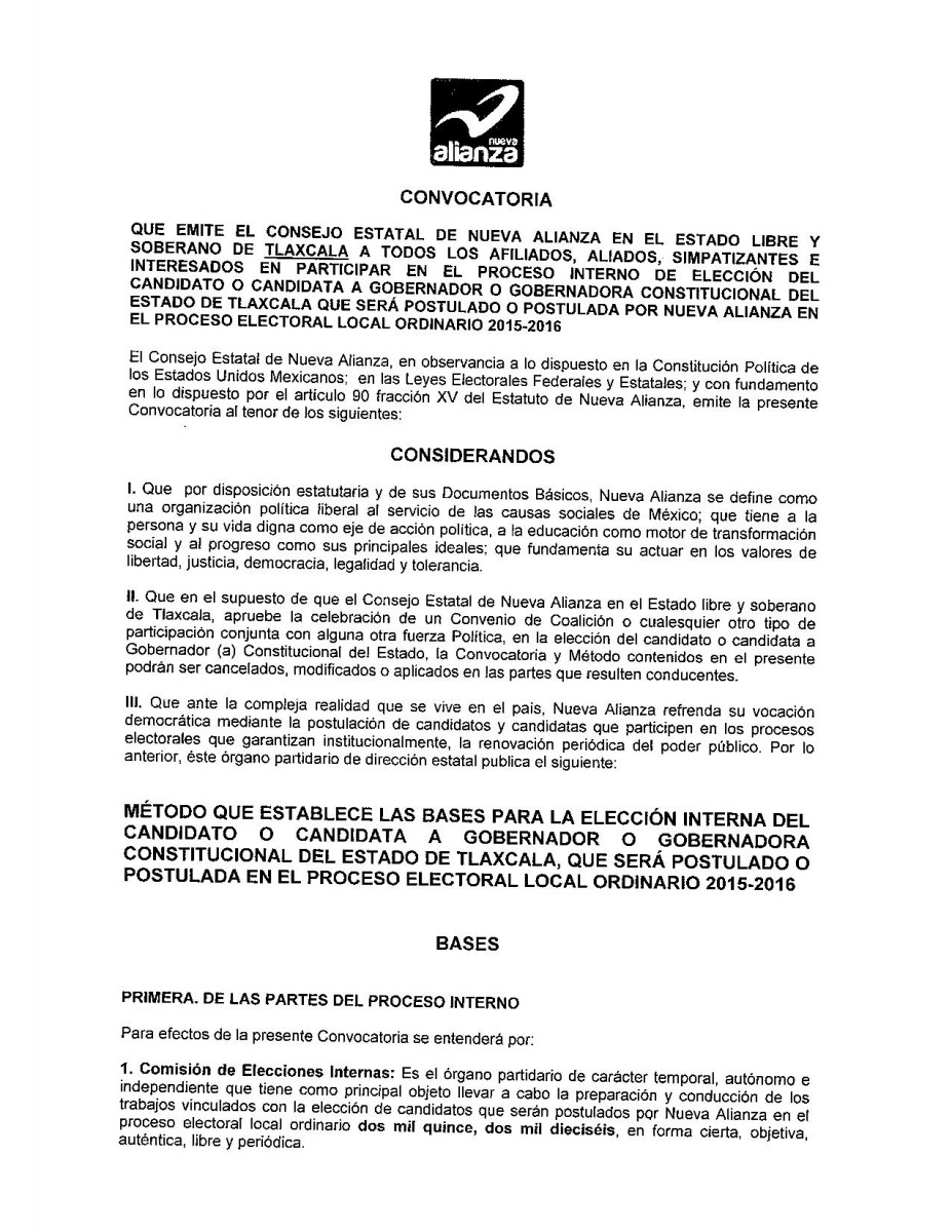 CONVOCATORIA PARA LA ELECCIÓN DE CANDIDATAS Y CANDIDATOS “PROCESO INTERNO” QUE SERÁN POSTULADOS POR NUEVA ALIANZA EN EL PROCESO ELECTORAL ORDINARIO 2015-2016
